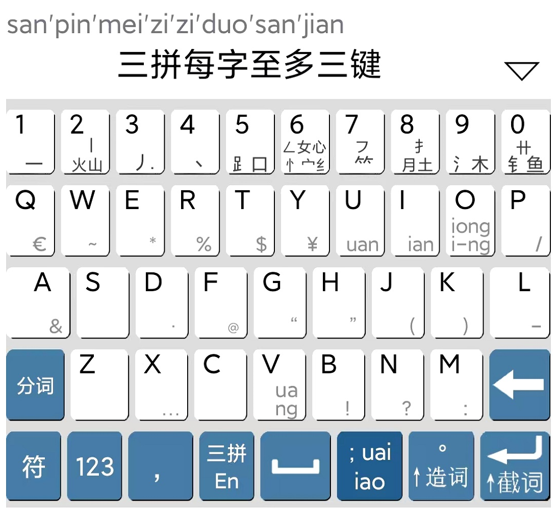 ◆ 三拼输入法,在“U I V O ;”5个键上,布置8个韵母,将3-4个字母组成的韵母压缩为1-2个字符输入。例如:“快”字,输入“k;”。三拼输入法既能够声母+韵母输入,也能够单用声母输入。比全拼减少约21%的击键量。同时兼容全拼输入。支持简体/繁体。支持语句输入。支持手动“造词”。 语句输入时可对句尾字、词采用笔画部首识别。